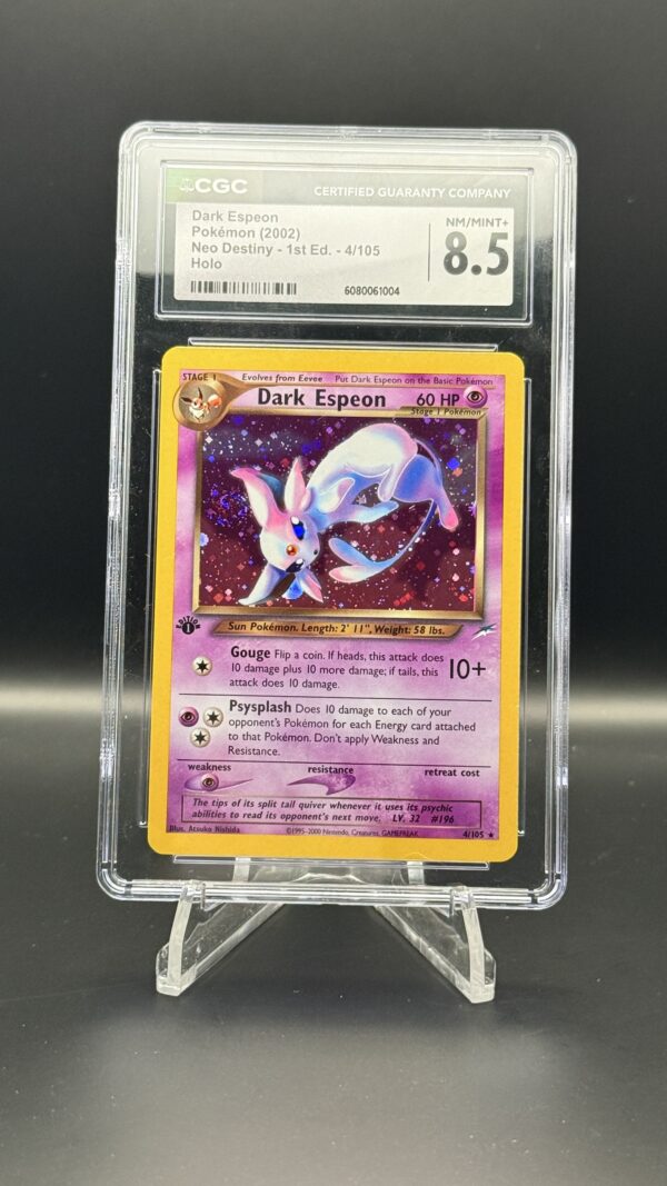 Available for secure worldwide shipping, this CGC 8.5 1st Edition Dark Espeon is ideal for collectors in the UK, USA, Europe and Asia. Whether you are completing a Neo Destiny 1st Edition master set, building an Eeveelution showcase or investing in rare vintage holographic cards, this Espeon offers exceptional quality, rarity and visual appeal.