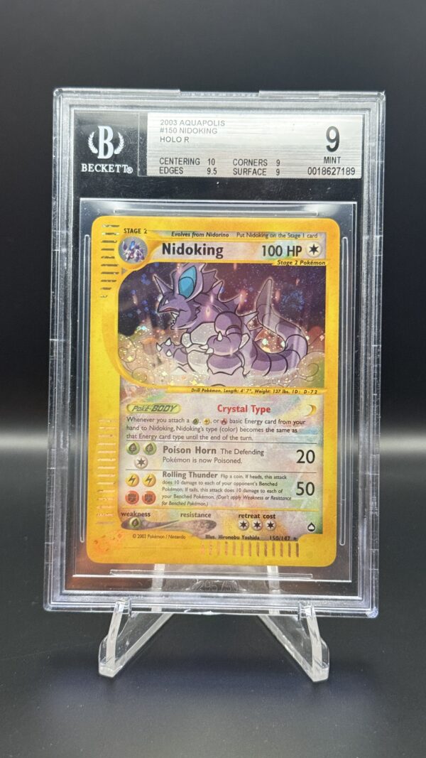 ✨ This exceptional Nidoking 150/147 Crystal Secret Rare Holo from the legendary Pokémon Skyridge set (2003) has been professionally Beckett graded 9, making it a premium high grade example of one of the most iconic and desirable Crystal cards ever printed. Featuring a beautiful holo swirl that enhances its display value, this card showcases vivid colour, brilliant holofoil and powerful e Reader artwork that captures Nidoking in stunning detail. With outstanding eye appeal and one of the strongest Beckett 9 presentations available, this Crystal Nidoking stands out as a true high end collectible from the final Wizards of the Coast era.