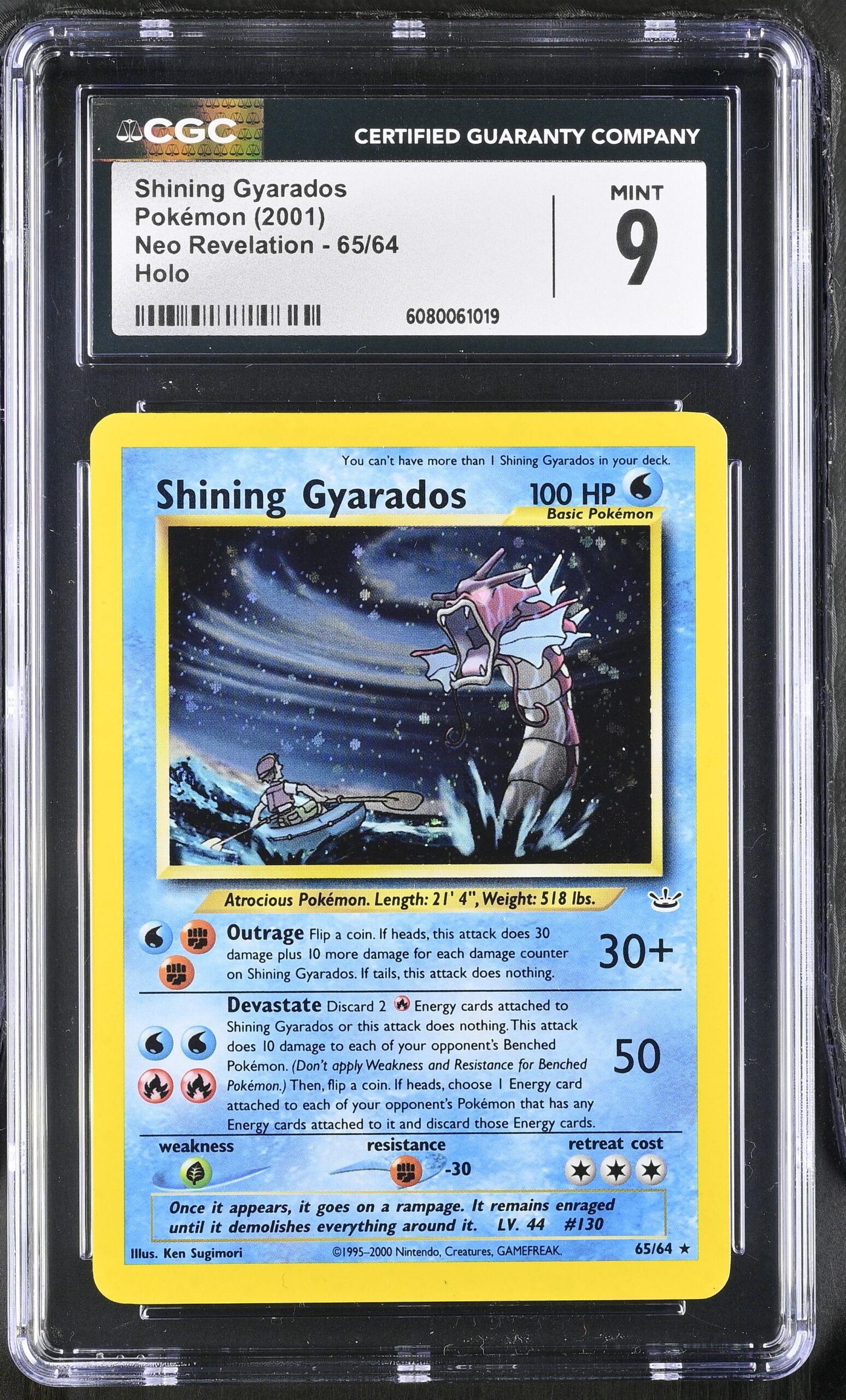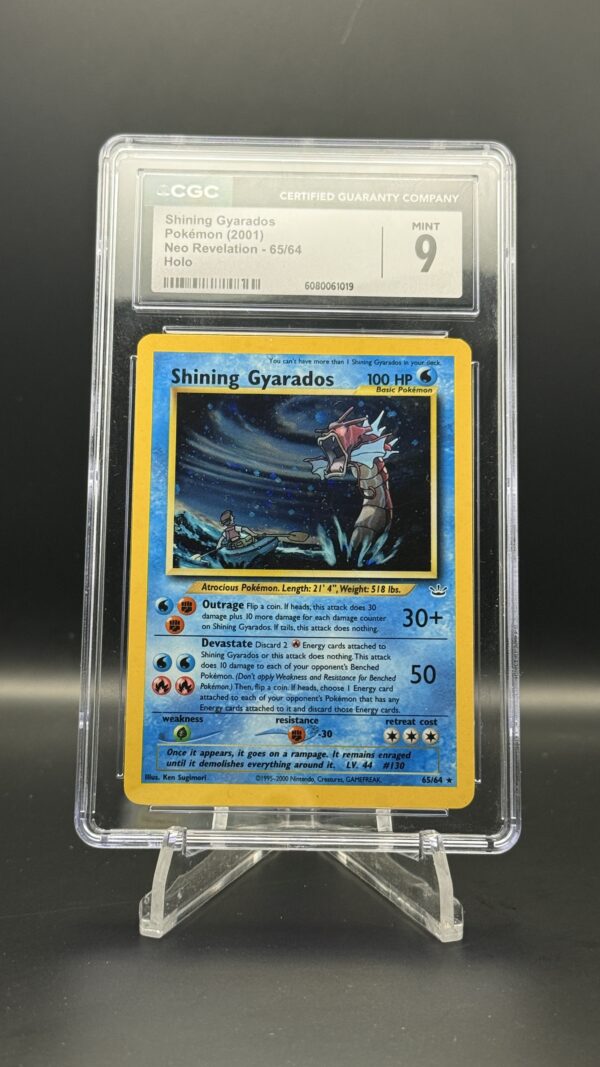 Neo Revelation introduced some of the most beloved Shining cards in the entire franchise and Shining Gyarados is widely considered one of the top chase cards. The artwork shows a wild and enraged Gyarados erupting from a stormy sea, creating one of the most cinematic scenes in vintage Pokémon history. With CGC 9 Mint condition and strong eye appeal, this copy delivers rarity, nostalgia and excellent collectability.